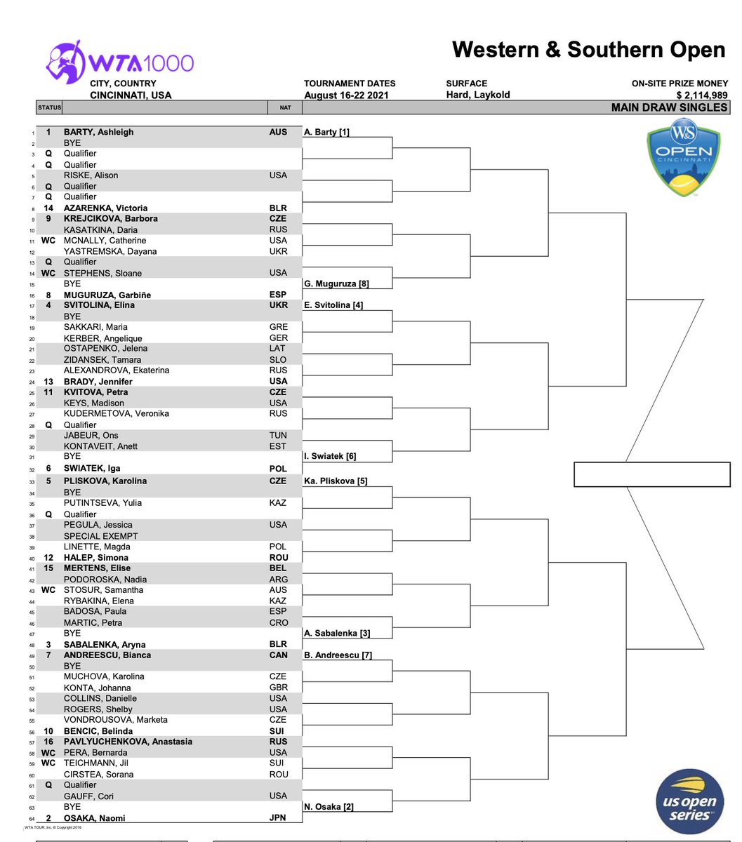 . Get all the latest WTA Western Southern Open 2022 Draws results and more. Osaka and Gauff on early collision course Barty returns The draw for the 2021 Western Southern Open is out and No1 Ashleigh Barty and No2 Naomi Osaka. 1 2 3 A part of the 2022 WTA Tour this tournament will mark the return of a WTA.
